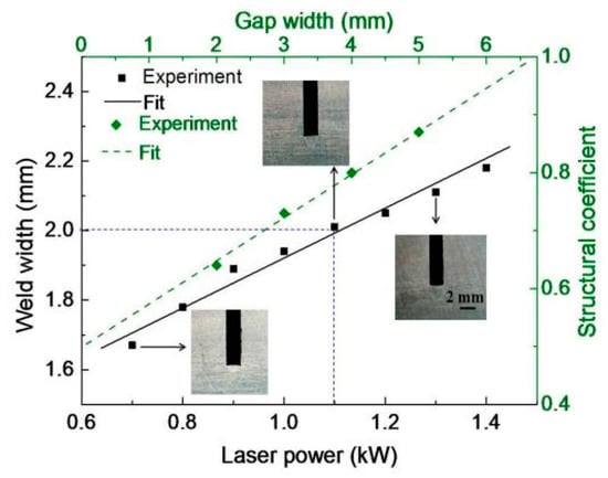 The ultra-narrow gaps whose gaps are 2 mm, 3 mm, 4 and 5 mm, respectively, but the depths are all 15 mm were manufactured on a 304 stainless steel plate with the thickness of 20 mm, and the welding experiments were conducted in these ultra-narrow gaps at a welding speed of 0.12 m/min. Figure 3 displays the variation rule of the weld width in the ultra-narrow gap with the increase of laser power when the gap width and the diameter of light spot are both 2 mm. One can observe that, when the laser power is 1.1 kW, the weld width in the ultra-narrow gap equals the diameter of light spot, 2 mm; and the plate on the edge of the light spot begins to melt at this moment. Under the same conditions, when the welding was performed on a stainless steel flat plate, the laser power for the fusion of the plate on the edge of light spot was 0.704 W (see Figure 2). According to Equation (2), one can calculate that the structural coefficient of a 2-mm ultra-narrow gap is 0.64 (i.e., b = 0.64). The welding experiments were repeated on the ultra-narrow gaps with the gap widths of 3 mm, 4 mm, and 5 mm, respectively, using the laser with the diameters of light spot of 3 mm, 4 mm, and 5 mm, respectively. The laser power when the weld width equals to the diameter of laser spot was measured. In combination with the laser power when the stainless steel flat plate on the edge of light spot begins to melt under the same conditions as shown in Figure 2, the structural coefficients of different ultra-narrow gaps can be calculated according to Equation (2), as denoted by the green line in Figure 3.