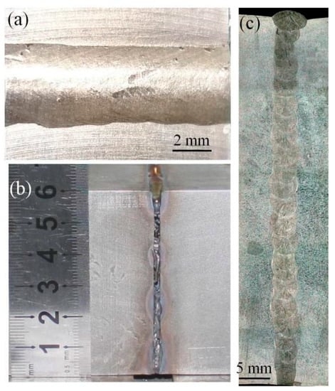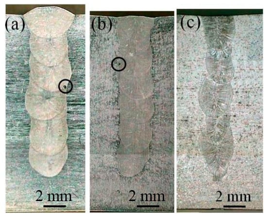 Sections of the weld seams in the ultra-narrow gaps with different widths ((a) 4.2 mm, (b) 3.2 mm, and (c) 2.2 mm, respectively).