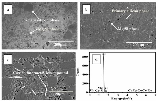 The microstructure of the unmodified Al-20Si alloy is mainly composed of the primary Si phase and eutectics, including α-Al and eutectic Si phases [30,31]. The eutectic Si phase exhibits an acicular or lamellar morphology, whereas the primary Si phase exhibits various complex morphologies, including pentagonal, plate-like, lath-like, and other irregular morphologies, with grain sizes varying from 80 to 120 μm [31]. Figure S2a shows the morphologies of the primary Si phase in the Al–20Si alloys, including plate-like and other irregular morphologies. The incorporation of modifying agents (e.g., rare earth metals and Mg) into the alloys can prominently alter the morphology of the primary Si phase or refine its grain size [28,29]. Figure 1 shows SEM micrographs of the Al–20Si–5Mg and Al–20Si–5Mg–0.7Ce alloy surfaces without HCPEB irradiation. In the case of the Al–20Si–5Mg alloy, a plate-like primary Mg2Si phase with a grain size of 20 μm is noted to appear after the addition of Mg. Moreover, the primary Si phase also exists in the form of a single plate-like morphology with an average grain size of 61 μm (Figure 1a). This result indicates that the morphology of the primary Si phase is substantially transformed from the original complex microstructure to the single morphology as a result of the modifying effect of the alloy additives, thereby substantially improving the mechanical properties of materials. In a related study, Huang et al. [29] surveyed the influence of Mg on the second phase of a hypereutectic Al–Si alloy and reported that when the Mg content exceeded 3 wt.%, a plate-like primary Mg2Si phase started to appear because of the reaction between Mg and Si in the alloy melt, as expressed in Equation (1):