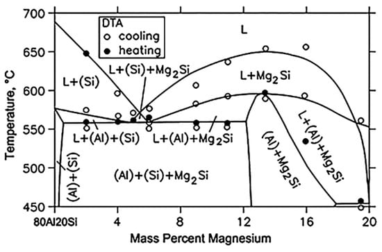 - Raghavan, V. Al-Mg-Si (Aluminum-Magnesium-Silicon). J. Phase Equilib. Diff. 2007, 28, 189–191. [Google Scholar] [CrossRef]
