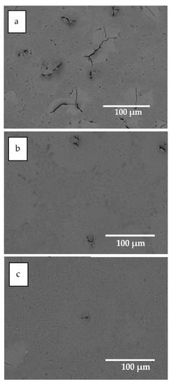 Figure 3 and Figure 4 show the SEM micrographs of the Al–20Si–5Mg and Al–20Si–5Mg–0.7Ce alloy surfaces irradiated by HCPEB, respectively. As evident in Figure 3, the microcracks appears on the surface of the HCPEB-irradiated Al–20Si–5Mg alloy. Only a small number of microcracks are observed for specimens treated using 25 pulses, implying that Mg efficiently suppresses the propagation of microcracks. However, the surface microcracks cannot be completely eliminated using only Mg. By contrast, small sized microcracks are observed to be exposed on the surface of the HCPEB-irradiated Al–20Si–5Mg–0.7Ce alloy after 15 and 25 pulses (Figure 4b,c), indicating that the addition of Ce almost eliminates the presence of microcracks. These results suggest that the microcracks induced by HCPEB are effectively eliminated by the synergistic effects between Ce and Mg.