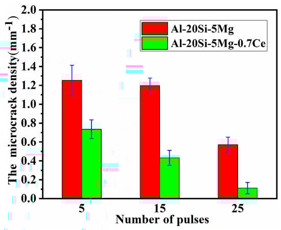 where ρ is the microcrack density (mm−1), L is the total microcrack length (mm), and S is the visual field area (mm2). Compared with the Al–20Si alloy specimens without modifying agents (Figures S2 and S3), the density of the microcracks decreased from 1.254 ± 0.16 mm−1 at five pulses to 0.571 ± 0.08 mm−1 at 25 pulses for the alloys with incorporated Mg (Figure 5). However, for the Al–20Si–5Mg–0.7Ce alloy specimens, the microcrack density corresponding to the same number of pulses was substantially lower than for the alloy specimens with incorporated Mg: 0.735 ± 0.1 mm−1 after five pulses and 0.112 ± 0.06 mm−1 after 25 pulses (Figure 5). These results indicate that the combination of Ce and Mg plays a substantial role in eliminating the microcracks as compared with the addition of Mg only.