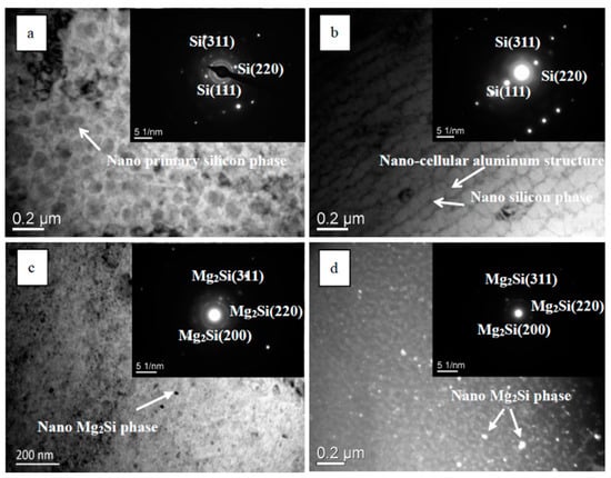 In the present study, the metastable structures in the surface layer of the Al–20Si–5Mg–0.7Ce alloy subjected to 25 pulse treatments were characterised by TEM and found to include a nano-primary Si phase, nano-cellular aluminium structure, and nano-Mg2Si phase, as shown in Figure 7. These structures apparently arise from the rapid heating and cooling effects excited by HCPEB irradiation. The nano-primary Si phase surrounded by α-Al phases evolves from the primary Si phase, which is a locally amplified structure of the primary Si phase after HCPEB irradiation (Figure 7a). The formation of this phase can be explained as follows: The rapid heating induced by HCPEB promotes the interdiffusion of Al and Si near the border of the primary Si phase, thus producing a crystal nucleus of primary Si in the molten surface layer. The crystal nucleus subsequently grows within a short time under the high cooling rate induced by HCPEB, resulting in the formation of the nano-primary Si phase [1,40,41]. The formation of this phase is accompanied by the diffusion of Al. The corresponding evidence is that the Al phase exists around the nano-primary Si phase. The diffusion phenomenon of Al has been confirmed elsewhere via SEM and EPMA analyses [36,39]. It is concluded that Al gradually permeates into the primary Si phase because of the rapid heating effect induced by HCPEB. The primary Mg2Si phase in the pristine microstructure is transformed into the nano-Mg2Si phase because of the rapid cooling effect excited by HCPEB. Figure 7b–d display the nano-cellular aluminium structure and nano-Mg2Si phase after 25 pulses. The nano-cellular aluminium structure with sizes ranging from 100 to 200 nm is located in the Al-rich area. In addition, the nano-Si phase with a size of 10 nm precipitates from the grain or subgrain boundary of the Al phase because of the eutectic Si dissolving into Al matrix under the HCPEB irradiation (Figure 7b). Analogously, the nano-Mg2Si phase with particle sizes ranging from 10 to 50 nm precipitates from the grain or subgrain boundary of the Al phase, as shown in the bright- and dark-field images in Figure 7c,d, respectively. The grain refinement can increase the total area of grain boundaries, resulting in enhanced resistance to microcrack propagation, thereby delaying the initiation of microcracks. In addition, in the selected-area electron diffraction patterns in Figure 7a,d, the second or dispersed phases generate a polycrystalline diffraction ring after HCPEB irradiation, thus indicating different crystal orientations. However, the nano-cellular aluminium structures also present single-crystal diffraction spots, implying that the structures can be classified as substructures because of their identical orientations. The formation of the metastable phases contributes to the enhancement of the anticorrosion and tribological properties of the alloy surface.