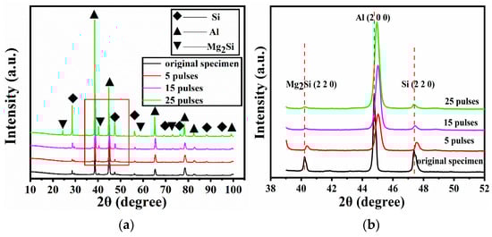 Figure 8 displays the X-ray diffraction (XRD) plots of the Al–20Si–5Mg–0.7Ce alloy specimens as a function of the number of pulses. As evident from Figure 8a, the phase transformation is invisible on the alloy surface irradiated via HCPEB. The phase composition mainly includes the Al, Si, and Mg2Si phases. However, Ce intermetallic compounds are not detected on the alloy surface. After HCPEB bombardment, the Ce intermetallic compounds melt, forming a Ce solid solution in the Al matrix. Because the concentration of this solid solution is far below the detection limit (5 wt.%) of the XRD diffractometer, this phase is invisible. In addition, broadening of the Mg2Si (220), Al (200), and Si (220) peaks between 38° and 52° is identifiable in the XRD plots of the specimens subjected to HCPEB irradiation in Figure 7b (locally magnified image of Figure 7a). Compared with the diffraction peaks of the initial specimen, those of the irradiated specimens first shift to higher angles at five pulses and then to lower angles after 15 and 25 pulses. The broadening of the diffraction peaks indicates the appearance of metastable phases caused by the grain refinement effect on the surface of Al alloy induced by HCPEB, consistent with the TEM analysis reported in Figure 6. The diffraction peaks are shifted to higher angles, which is associated with the formation of the residual compressive stress and supersaturated solid solution in the modified layers. Correspondingly, the shift of the diffraction peaks towards lower angles is attributed to the existence of residual tensile stress [36]. In brief, the observed peak broadening and shifting result from the synergistic effects of residual stresses and grain refinement induced by HCPEB irradiation.