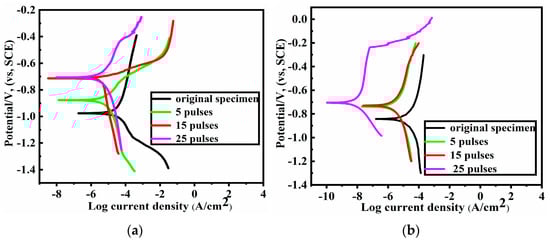 Electrochemical polarisation curves of HCPEB-irradiated and HCPEB-unirradiated Al–20Si–5Mg and Al–20Si–5Mg–0.7Ce alloy surfaces. (a) Al–20Si–5Mg alloy; (b) Al–20Si–5Mg–0.7Ce alloy.