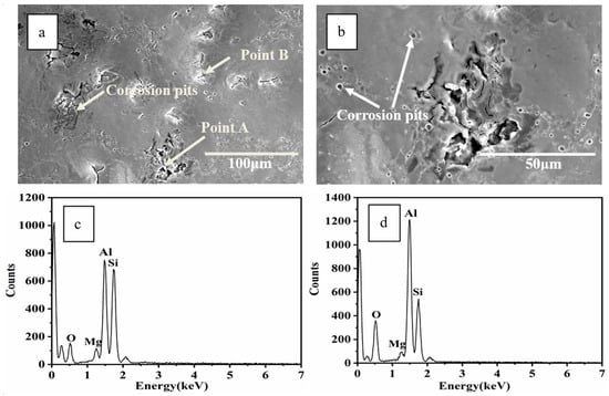 Surface morphology of 25-pulse-treated Al–20Si–5Mg alloy surfaces after electrochemical corrosion testing. (a) Low magnification micrograph; (b) high magnification micrograph, enlarged micrograph of Figure 10a; (c) EDS profile of point A in Figure 10a; (d) EDS profile of point B in Figure 10a.
