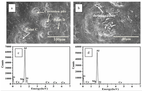 Surface morphology of 25-pulse-treated Al–20Si–5Mg–0.7Ce alloy surfaces after electrochemical corrosion testing. (a) Low magnification micrograph; (b) high magnification micrograph, enlarged micrograph of Figure 11a; (c) EDS profile of point C in Figure 11a; (d) EDS profile of point D in Figure 11a.