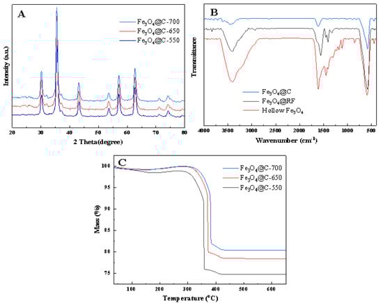 In order to confirm the crystal information of the inorganic components in the prepared Fe3O4@C microspheres, XRD detection was carried out as can be seen in Figure 3A. The diffraction peaks of Fe3O4@C-550 and pure Fe3O4 (JCPDS card no. 19-0629) were exactly the same. The main diffraction peaks of Fe3O4@C-650, Fe3O4@C-700 and Fe3O4@C-550 were basically the same, indicating that the magnetic components in the Fe3O4@C microspheres were mainly Fe3O4. Figure 3B shows the FTIR spectra of hollow Fe3O4, Fe3O4@RF and Fe3O4@C. After coating with phenolic aldehyde, the elastic shock absorption peak of the C-H bond on the aromatic hydrocarbon appeared near 3100 cm−1. Moreover, 1612 cm−1, 1448 cm−1 and 1406 cm−1 were the stretching shock absorption peaks of the benzene ring C=C skeleton, indicating the presence of a benzene ring (phenolic). After carbonization, the absorption peak of the sample was significantly reduced, and the absorption peak of the organic matter basically disappeared, indicating that the carbonization was relatively complete. The absorption peak of 1614 cm−1 was attributed to the stretching vibration of the unsaturated C=C bond. The TGA curves of the Fe3O4@C microspheres prepared at different carbonization temperatures are shown in Figure 3C. The mass remaining after high-temperature calcination was used as the content of the magnetic component, and the mass increase caused by the conversion of Fe3O4 to Fe2O3 during this process was ignored. Fe3O4@C began to lose weight when the calcination temperature reached about 350 °C. With the increase in the carbonization temperature during the preparation process, the temperature of the initial weight loss increased, indicating that the carbonization temperature can improve the thermal stability of Fe3O4@C microspheres. The magnetic content of Fe3O4@C-550, Fe3O4@C-650 and Fe3O4@C-700 was 19.58%, 21.56% and 25.22%, respectively [25,26].