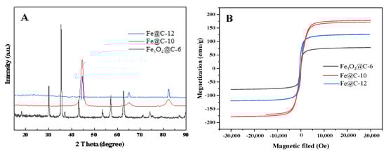 The crystal form of the carbonized products of Fe3O4@RF microspheres with different shell thicknesses was determined, and the XRD pattern is shown in Figure 5A. The XRD peaks of the Fe3O4@RF-6 carbonization products at 18.3°, 30.1°, 35.5°, 43.1°, 53.4°, 57.1° and 62.8° corresponded to the inverse spinel structure Fe3O4 (JCPDS75-0033) crystal faces of (111), (220), (311), (400), (422), (511) and (440) in the face-centered cubic lattice [27,28]. This showed that Fe3O4 had not been reduced at this time. The XRD patterns of the products with the carbonization time of 10 h and 12 h had the same peak positions. The diffraction peaks at 44.7°, 65.2°, and 82.5° in the spectrum corresponded to the (110), (200), and (211) crystal planes of elemental Fe. This was highly consistent with the standard XRD pattern of Fe (JCPDS 87-0722) in the peak position and intensity. There were no other impurity peaks, indicating that Fe3O4 was completely reduced to Fe crystals with higher crystallinity. The magnetic properties of the prepared products were analyzed using the vibrating sample magnetometer. The VSM curve is shown in Figure 5B. The maximum specific saturation magnetization of Fe3O4@C-6, Fe@C-10 and Fe@C-12 was 77 emu/g, 123 emu/g and 177 emu/g, respectively. Before Fe3O4 was reduced to Fe, the magnetic properties of the microspheres were relatively low, but after the reduction, the magnetic properties were significantly enhanced. Meanwhile, the coercivity of the three samples, Fe3O4@C-6, Fe@C-10 and Fe@C-12, was 25 Oe, 265 Oe and 14 Oe, respectively, and the three were quite different. The coercive force represented the magnetic loss performance of the sample to a certain extent, but the subsequent analysis showed that the dielectric loss still dominated the EMW absorption.