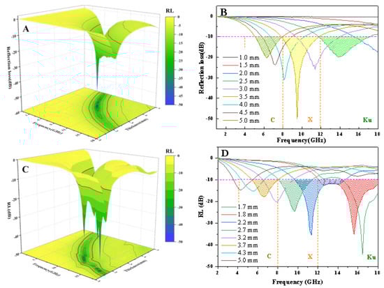 Figure 7. Three-dimensional and two-dimensional curves of the reflection loss of magnetic composite microspheres: Fe@C-12 (A,B) and Fe3O4@C-700 (C,D).