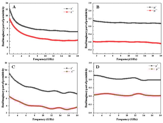 Figure 8. Dielectric constant and permeability of magnetic composite microspheres: Fe@C-12 (A,B) and Fe3O4@C-700 (C,D).