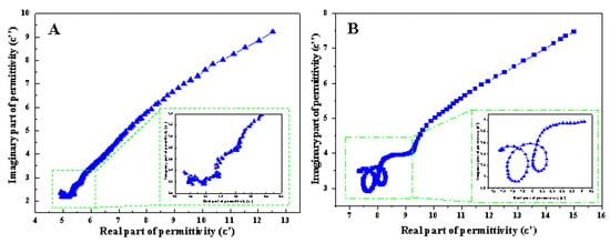 Figure 10. The real part (ε′) versus imaginary part (ε″) curve of the dielectric constant of magnetic composite microspheres: Fe@C-12 (A) and Fe3O4@C-700 (B).