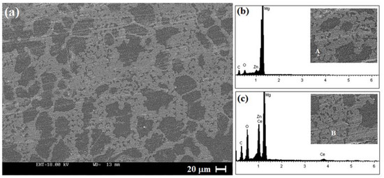 As shown in Figure 2a, the microstructure of Mg-Zn-Ce alloy consists of α-Mg and a small number of intermetallic phases, which are mainly located within grain boundaries. According to the EDS test, Mg, Zn, and Ce are the marked area constituents, possibly showing the presence of Mg12Ce phases (Figure 2b,c). The XRD analysis will confirm the formation of the aforementioned phases.