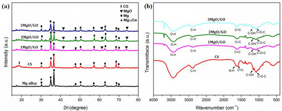 According to the XRD spectrum, the main phases in the Mg-Zn-Ce alloy are α-Mg, and Mg12Ce (Figure 4a). The CS coating exhibited broad peaks at 2θ = 10°–20°, whereas the CS/MgO-GO coating revealed the presence of an amorphous CS structure [29]. With the addition of GO and MgO, the intensity of the characteristic peak of CS decreases, indicating an increase in amorphous CS content. It was determined that the majority of the CS/MgO-GO coating was comprised of Mg and MgO. The CS/MgO-GO coating showed characteristic peaks at ~42.7° and ~62.1° related to (111) and (200) planes respectively corresponding to MgO [18,30]. Because of the coating structure, the substrate peaks were reflected in the patterns, allowing X-ray to reach the internal substrate. Commonly, the diffraction peak of GO appears around 12°, but no characteristic peak of GO was observed in this work. This could be attributed to the prepared films possess low amount of GO and also have poor crystallization [31]. In this respect, Askarnia et al. reported [12] that characteristic diffraction of graphene oxide at about 2θ = 10° was not detectable due to the low content of GO in HAp/CS/GO coatings.