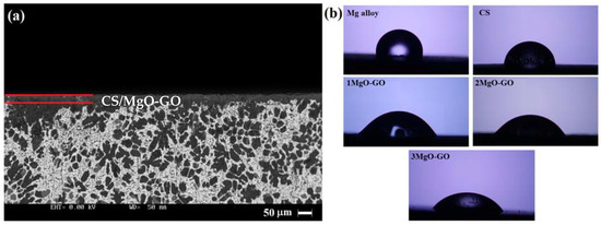 The thickness of the CS/MgO-GO coating was determined by cross-section observation to be between 38–42 μm (Figure 5a). The thickness of the CS-based films with different amounts of MgO-GO fillers did not differ significantly. Surface wettability is an important factor influencing corrosion performance and bioactivity of biomaterials [33]. Contact angle measurements were used to determine the wettability of the coated and uncoated samples (Figure 5b). Bare Mg alloy and neat CS have water contact angles (WCA) of 92.3° and 84.4°, respectively. Nevertheless, the WCA of the CS/MgO-GO coating decreased from 58.7° for 1MgO-GO to 51.2° for 3MgO-GO as the concentration of MgO-GO increased. The surface wettability of the coated samples was higher than that of the uncoated Mg alloy. This behavior can be attributed to the presence of functional groups (carboxyl group, carbonyl group, and hydroxyl group) at the edges of GO, which contributes to the hydrophilicity of the coatings, as well as the hydrophilic nature of chitosan [12,33] in the CS/MgO-GO nanocomposite coatings. Furthermore, increasing the MgO-GO content of CS-based coatings improved their hydrophilicity characteristics.
