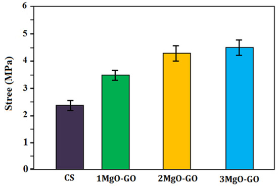 The adhesion test was used to evaluate the adhesion strength of the CS and CS/MgO-GO nanocomposite coatings deposited on Mg alloy. According to Figure 6, the adhesion of the CS coating on the Mg alloy was 2.64 MPa before composite coating, but this value increased to 4.42 MPa after composite coating, demonstrating the effective role of MgO-GO fillers in improving coating adhesion strength. In fact, one of the most important factors in achieving long-term implant use without premature failure in vivo is strong interfacial bonding between them [22]. There are oxygen functional groups at the GO sheet’s edges which can conveniently form hydrogen bonds with functional oxygen groups comprising CS. At the same time, there is strong bonding between the Mg-O and CS layer sites (=O). On the other hand, the integration of MgO-GO into the CS layer, on the other hand, has a major effect on the adhesion strength between the Mg alloy specimen and the CS/MgO-GO nanocomposite coating [22,26]. In this regard, it was reported [34] that the newly formed hydroxyl groups on the Mg alloy surface may improve coating adhesion to the substrate via chemical interaction with coating molecules.