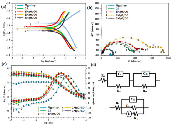 EIS analysis was carried out by generating Nyquist plots for the bare Mg, CS, and CS/MgO-GO coatings, as shown in Figure 7b. Based on the fitting results, the Rct values for CS (1021.5 Ω.cm2) and CS/MgO-GO were 1536.5 Ω.cm2 (1MgO-GO), 1808.6 Ω.cm2 (2MgO-GO), and 1257.2 Ω.cm2 (3MgO-GO), which were significantly higher than the bare Mg alloy (401.2 Ω.cm2). The results confirmed the higher electrochemical impedance of the CS/MgO-GO composite coating for Mg alloy, protecting substrates from over-quick degradation. The lower Rct value of CS/3MgO-GO coated specimens compared to CS/2MgO-GO and CS/1MgO-GO coated samples is due to the presence of more MgO/GO aggregates in the CS/3MgO-GO film, which led to the reduction in corrosion rate. A higher value of the low-frequency impedance modulus, |Z|, indicates better corrosion protection performance [35]. As shown in Figure 7c, the value of |Z| for the CS and CS/MgO-GO coatings was greater than that of the uncoated Mg alloy. Furthermore, the phase angle (θ) at high frequency can be used to assess the completeness of the coating under the influence of corrosive electrolyte [35,36]. In Figure 7c, the phase angles of coated samples in the medium frequency range became loftier, indicating that a passivation film had formed on the surface of the samples as an inhibitor against corrosion. A complete coating has a phase angle close to 90°, whereas the bare substrate has a phase angle close to 0° [37]. The uncoated has a high frequency of phase angle of 50°, demonstrating the sample’s unsatisfactory integrity. The capacitance behavior of CS/MgO-GO coating has the widest frequency range, and its phase angle is increased by approximately 60°, indicating that the formation of CS/MgO-GO coating can improve the corrosion resistance of the substrate. The equivalent is used to characterize the samples, where Rs denotes the solution resistance, CPE coat denotes the coating capacitance, Rct denotes the charge transfer resistance, and CPE-dl denotes the electric double-layer capacitance of the passive film (Figure 7d). This finding indicates that the coencapsulation of MgO and GO fillers into CS film have the potential to elevate the corrosion resistance of the Mg alloy substrate.