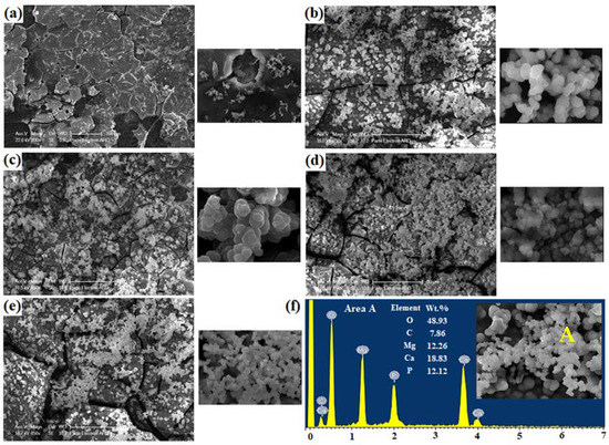 The morphology of the surface of the various specimens after 14 days of immersion in the SBF is depicted in Figure 8a–e. After 14 days, the uncoated Mg alloy showed obvious degradation, with pitting corrosion clearly visible and a loose corrosion layer with deep cracks developing on the uncoated Mg alloy. The CS coating, on the other hand, remained intact after 14 days, with only a few surface cracks and no evidence of pitting corrosion was found. A thick layer of biomineralization was present on the surface with numerous white spherical particles, as seen in the high-magnification image. A similar biomineralization layer was observed for the CS/MgO-GO coating. The CS/MgO-GO coating’s biomineralization layer was smoother with fewer defects compared to CS coating. According to the EDS spectra (Figure 8f), the precipitates layer consists of Mg, O, C, Ca, and P demonstrating the Mg(OH)2 and hydroxyapatite (HAp) creation during the immersion. A large amount of mineralization layer covered the surface of the CS/MgO-GO coated film. After 14 days of immersion, CS containing GO and MgO deposited substrates show the formation of compact apatite precipitates on their surfaces. The inclusion of graphene oxide and MgO accelerate the formation of HAp on the coated surface. Surface functional groups on the surface of GO and MgO, such as –COOH and –OH, act as nucleating centers and provide a superior biomineralization process [21,22,33]. These functional groups provide negative charges on the surfaces, which encourages more Ca2+ cations from the SBF medium to interact electrostatically, resulting in the formation of an apatite-rich layer. Furthermore, the hydroxyl ions (OH–) through SBF are electrically drawn to this Ca-rich positively charged surface, resulting in the precipitation of a bone apatite compound on the surfaces of the implant.