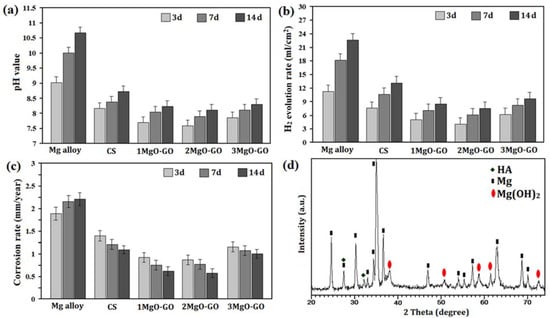 During the biodegradation procedure, the coated Mg alloy had significantly lower pH values than the Mg alloy without coating. During the first 7 days, the pH value of the bare Mg alloy samples increased dramatically from 7.40 to 10.10, while the trend was reversed for the coated Mg alloy samples, particularly the CS/MgO-GO samples (Figure 9a). The pH value of the CS/MgO-GO coated Mg alloy sample increased steadily and slowly over 14 days, changing only from 7.88 to 8.76. The slope of the pH curve of the bare and coated samples decreased as the immersion time increased for all specimens. This finding may be due to the samples’ reduced surface area, which delay initiation of corrosion process. During the first few days of exposure, a larger surface region was exposed to the solution, resulting in more degradation processes and the generation of hydroxide (OH) ions, increasing the pH value. However, when the exposure time was increased to 7 and 14 days, the pH value of the composites decreased and then remained stable. This phenomenon could be explained by the longer immersion time, which results in the development of protective films from corrosion products on the sample surface. These corrosion product films inhibit the specimens from coming into direct contact with the solution, lowering the pH of the specimens. Meanwhile, as shown in Figure 9b, after 14 days of immersion, the coated samples released significantly less hydrogen than the bare Mg alloy (22.8 mL/cm2). The measured volume of hydrogen evolution for CS coated samples was 12.7 mL/cm2, 8.8 mL/cm2 for CS/1MgO-GO coating, and 7.9 mL/cm2 for CS/2MgO-GO coating, all of which agreed with the pH value results. This was mainly due to the compact and protective layer of CS/MgO-GO that was effectively applied to the Mg alloy surface, which can successfully preserve the substrate from the corrosion medium and certainly decrease the hydrogen evolution rate [37]. Furthermore, the weight loss of the CS/MgO-GO sample was 0.58 mm/y, which was much lower compared to the CS coating (1.24 mm/y) and bare Mg alloy (2.47 mm/y) (Figure 9c). These findings indicated that the CS/MgO-GO coating showed the greatest corrosion resistance even after a precise 14-day immersion test. The bare sample has the highest corrosion rate, while the coated specimen has lower corrosion rates because CS/MgO-GO acts as a barrier film and reduces the infiltration rate of corrosive solution inside the substrate, and hence decline the biodegradation rate. Furthermore, the existence of MgO particles and GO within the CS film can operate as a reinforcing agent, increasing the coating layer’s stability. Furthermore, these particles promote the formation of corrosion products containing hydroxyapatite, which slows the penetration of SBF to the substrate, and provide protection resulted in slowing the degradation rate. XRD spectra for the composite coating were used to confirm the precipitation of HAp on the surface of the composite coating containing GO and MgO, as shown in Figure 9d. The XRD pattern of the CS/MgO-GO composite coatings verify that the corrosion products were primarily composed of Mg(OH)2 and HAp, implying that the biomineralization layer was primarily containing HAp.