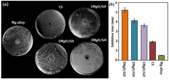 The ability of the produced coatings to inhibit gram-negative (Escherichia coli) bacteria was investigated through direct contact with an agar medium. The results showed that the CS/MgO-GO coatings on Mg alloy substrates inhibited the bacterial activity of the strains (Figure 10). In comparison to the large inhibition area created for gram (–) bacteria (5.3 mm), neither the bare Mg alloy samples nor the coatings with CS coating successfully inhibited bacterial growth, even though, as reported in the literature, CS could possess antibacterial properties [8,38]. The low concentration of chitosan in the coatings may have influenced the results [38]. At the same time, the zones of antibacterial activity against E. coli colonies increased in the sequence of bare Mg alloy < CS < CS/1MgO-GO < CS/2MgO-GO < CS/3MgO-GO. The release of MgO and GO has a strong inhibitory effect on bacterial growth. When bacterial cells come into contact with MgO and GO, they are eventually destroyed due to various mechanisms such as oxidative stress, membrane stress, and/or wrapping isolation. Bacterial growth will be inhibited bacteriostatically or bactericidal by these mechanisms, which may operate independently or in combination [26]. Among the various suggested mechanisms for GO’s antimicrobial performance, mechanical destruction to bacteria membranes through sharp edges of GO when contacting directly with GO and the formation of reactive oxygen species (ROS) occurred when oxidative stress generated by GO and charge transfer are more circumstances [7,39]. MgO as another antibacterial agent reacts with intracellular oxygen to produce ROS such as H2O2, OH• and O2•–, which may be released into the medium and thus inhibit bacterial proliferation and growth [19,26]. Consequently, co-encapsulation of MgO-GO into the CS layer surface significantly inhibited the bacterial activity of the strains; thus, CS/MgO-GO coating containing the highest amount of MgO-GO showed the best antibacterial activity.