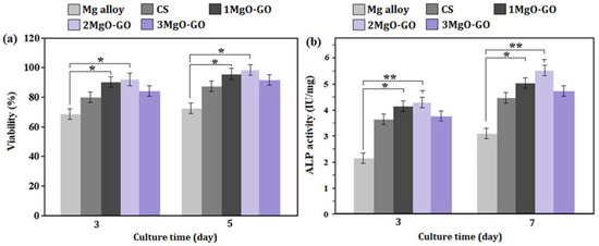 (a) Cell viability, and (b) ALP activity of MG63 cells cultured for various times on uncoated Mg, and Mg alloys coated with CS, CS/1MgO-GO, CS/2MgO-GO, and CS/3MgO-GO (* p < 0.05, and ** p < 0.01).