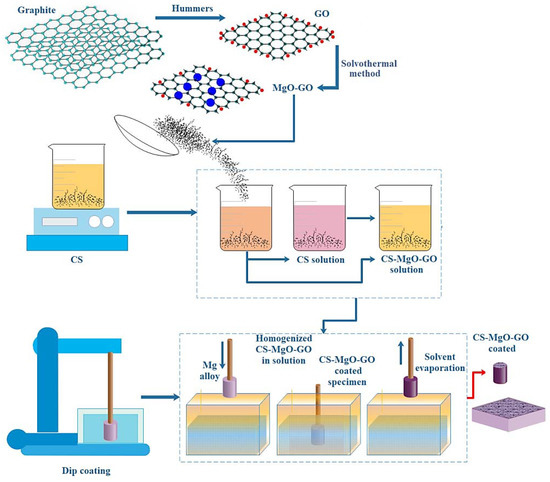 Schematic of preparation process of CS/MgO-GO nanocomposite coating on Mg alloy.