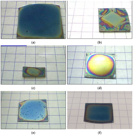 Although the spin-coating process is known to be a technique transportable to a large-scale deposition, the effects of the substrate size and shape have rarely been studied. The known effects only concern an increase in cracks, in the case of samples of a few tens of cm2 during the liquid phase deposition [49]. The substrate size and shape have been carefully chosen by elaborating samples with a length from 10 to 40 mm and a length to width ratio from 1 to 2. Samples as small as 10 mm in size are affected by relatively large edge effects (Figure 2c), while samples up to 40 mm in size show some small spots due to the liquid retraction during the evaporation process. In addition, the length to width ratio should not exceed 2, as the liquid spreading into a very thin homogeneous liquid film requires the symmetry of samples. In the present work, a typical size of 20 mm × 20 mm is chosen to obtain samples free of cracks with a nano-granular structure.