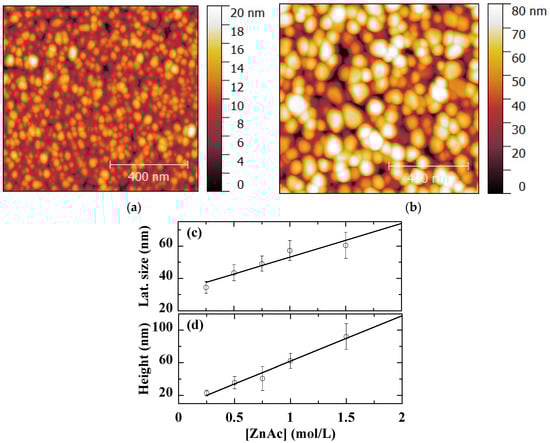 The granular morphology of ZnO thin films observed by AFM is shown in Figure 4a,b for [ZnAc] = 0.25 and 1.00 mol/L, respectively. The AFM lateral size and height for the whole concentration set are plotted in Figure 4c,d, respectively. The grain size gradually increases from a value of 30 to 60 nm. The AFM height linearly increases from 20 to 80 nm within the studied reagent concentration range.
