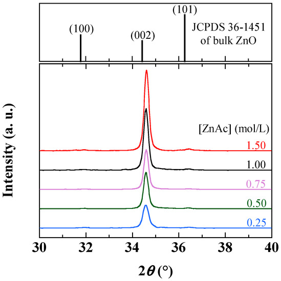 X-ray diffractograms of sol-gel spin-coated ZnO samples obtained with various ZnAc contents. The JCPDS 36-1451 of bulk ZnO within the same 2θ range is also displayed.