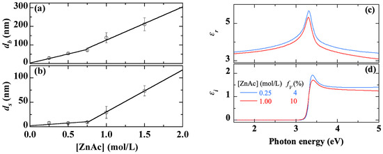 The spectra of the real (εr) and imaginary (εi) parts of the dielectric function of the deposited material are shown in Figure 6c,d, respectively. We have restricted the presentation to two extreme values of [ZnAc] for readability, not to overload the figures. εi shows the bandgap peaking step near 3.4 eV (Figure 6d), related to the strong excitonic absorption, with transparency below the bandgap, attesting of the good crystal quality. εr is determined by Kramers-Kronig relations (Figure 6c). The effective porosity associated with the dielectric function amplitudes evolves from 4% to 10% by increasing [ZnAc] from 0.25 to 1.50 mol/L. The increase in porosity is due to grain size (Figure 3b and Figure 4b), as the smaller the grains the denser the structure.