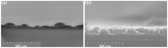 ZnO thin films were deposited under standard conditions on three types of substrates: c-Si, SiO2/c-Si, and glass, leading to a homogeneous film regardless of the substrate type. Figure 11 shows the cross-sectional SEM images of ZnO films deposited on c-Si (Figure 11a) and glass substrate (Figure 11b), respectively. They present the morphology of grains closely packed together. The films deposited on SiO2/c-Si and c-Si substrates show a similar grain morphology with grains separated by small voids. In the case of a glass substrate (Figure 11b), the sample exhibits a different granular structure with separate larger grains presenting a rounded top shape leaving more voids between them.