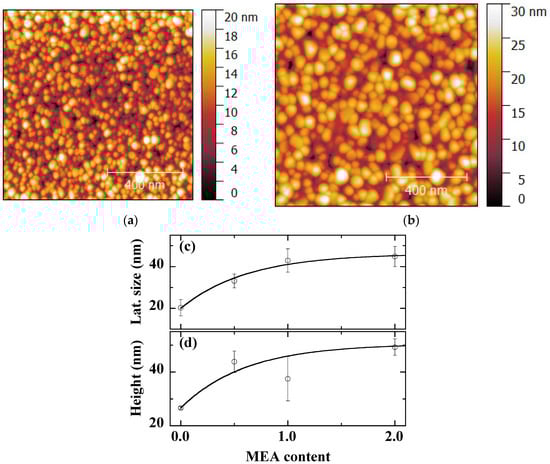 The AFM micrographs of Figure 8a,b confirm the granular morphology of the ZnO thin films obtained both without (r = 0, Figure 8a) and with MEA (r = 1.0, standard sample, Figure 8b). The samples are typically made of grains with particularly smaller size without the chelating agent. In this case, the sample has a different morphology, as it is not completely homogeneous and has a very small thickness. AFM data for the entire MEA content are shown in Figure 8c,d. The lateral dimension, close to 20 nm without MEA, grows to about 40 nm for high MEA contents (Figure 8c). At the same time, the AFM height, of about 25 nm without MEA, rapidly reaches about 45 nm in the presence of MEA (Figure 8d).