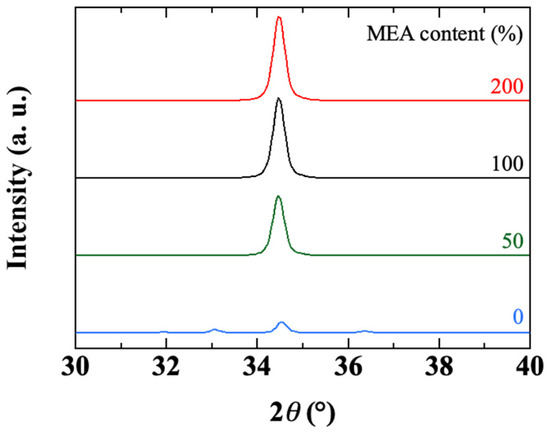 X-ray diffractograms of sol-gel spin-coated ZnO samples obtained with various MEA contents.