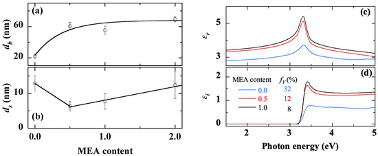 Thickness of the bulk layer (a) and the surface roughness (b), real (c) and imaginary (d) parts of the dielectric function extracted from SE measurements on sol-gel spin-coated ZnO samples obtained with various MEA contents. The curve and the lines in Figure 10a,b, respectively, are provided as guides for the eye.