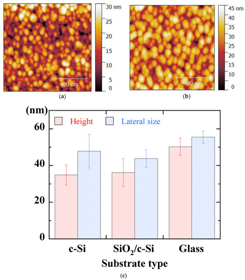 AFM micrographs of ZnO thin films deposited on c-Si and glass substrates are shown in Figure 12a,b, respectively. These images show a very similar grain morphology. Figure 12c summarizes the AFM data (lateral size and height) for all the substrates we tested. The lateral size increases from 45 nm for the SiO2/c-Si and c-Si substrates to 55 nm for the glass substrate. The AFM height increases from 35 nm for the SiO2/c-Si and c-Si substrates to 45 nm for the glass substrate. In the case of glass, the morphology can be thought to be different with a structure of larger grains separated by large voids.