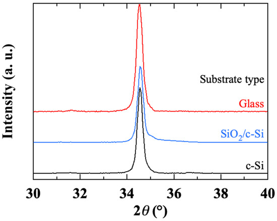 Figure 13 displays the XRD spectra of ZnO thin films on various substrates. The spectra show a strong peak (002) and an intensity ratio of peaks (100) and (101) to peak (002) of less than 0.01, indicating a very good orientation of these samples with the c-axis perpendicular to the substrate surface. Peak (002) gives, according to Scherrer’s formula, a crystallite size of about 35 nm in the case of both SiO2/c-Si and c-Si substrates, but about 30 nm for the glass substrate. This result implies a weak epitaxial effect due to crystalline silicon. The crystalline or amorphous state of the substrate surface may therefore influence the liquid-substrate interaction during the deposition of the first layer.