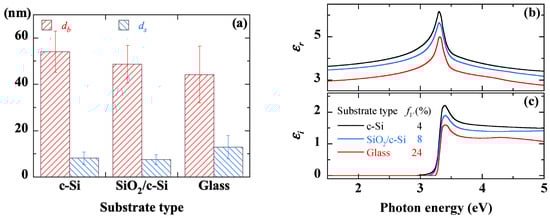 The results derived from the SE measurements are displayed in Figure 14. The roughness (ds) remains less than 10 nm for all the samples (Figure 14a). The films deposited on both SiO2/c-Si and glass substrates have a similar thickness of the bulk layer (db) in the range of 50–55 nm, whereas the film deposited c-Si exhibits slightly higher thickness (Figure 14a). These slight variations in thickness would be due to differences in interaction between the substrate and the liquid during the first moments of deposition.
