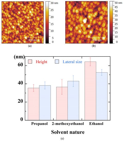 Figure 16a,b show AFM micrographs corresponding to samples elaborated with propanol and ethanol, respectively. The samples present similar granular aspects with, nevertheless, a significant difference in terms of grain size. In the case of ethanol (Figure 16b), the resulting film is porous with large grains. This could be an advantage in applications requiring a reactive surface grade such as photocatalytic activities. The AFM data (lateral size and height) for the different solvents are summarized in Figure 16c. The lateral size, around 45 nm using 2-methoxyethanol or propanol, grows to 55 nm with ethanol. The AFM height increases from 35 nm with 2-metoxyethanol and propanol to 60 nm with ethanol, in agreement with the increase in film thickness (see Figure 15), which will also be confirmed by ellipsometry measurements. The particular morphology, with large voids between neighboring grains, obtained in the case of ethanol (Figure 16b) would be a consequence of a relatively high deposition rate, which would favor the formation of large grains to the detriment of a relaxation of agglomerates and a densification of the layer.
