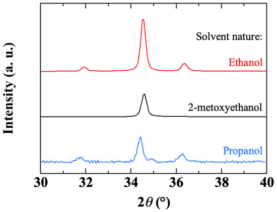 The XRD spectra of ZnO thin films obtained with various solvents are displayed in Figure 17. The sample obtained with 2-methoxyethanol shows a high-intensity (002) peak with almost no (100) and (101) peaks. Using propanol or ethanol, peaks (100) and (101) appear on either side of the high-intensity (002) peak, suggesting a lower crystallinity quality. The intensity ratio of the (100) peak to the (002) peak is 0.2 for propanol and 0.1 for ethanol, whereas it is less than 10−2 for 2-methoxyethanol. Using the (002) peak, Scherrer formula gives a mean crystallite size of around 35 nm for all solvents.