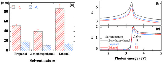 The results derived from SE measurements are shown in Figure 18. The thickness of the bulk layer, quite close to 50 nm with both propanol and 2-methoxyethanol, increases considerably to about 90 nm using ethanol (Figure 18a). For all samples, the roughness below 20 nm is indicative of good surface quality (Figure 18a). The spectra of the real and imaginary parts of the dielectric function of ZnO thin films made with the three different solvents are shown in Figure 18b,c, respectively. The excitonic peak is slightly higher in the case of 2-methoxyethanol, in agreement with a higher crystallographic quality, in comparison with propanol or ethanol. The porosity increases from 8% with 2-methoxyethanol to 11% and 12% with propanol and ethanol, respectively. Such porosity would be relative to the voids between grains in the case of a coarse-grained sample.