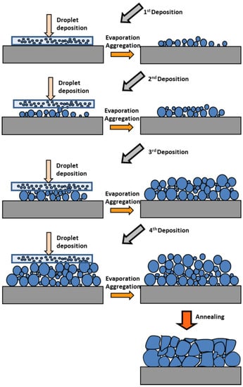 The elaboration of very thin layers by liquid phase deposition and spin-coating is based on the process shown in the diagram of Figure 1. The liquid phase, consisting of the suspension of ZnO precursors, involves the dissolution of zinc acetate dehydrate (ZnAc, Zn(CH3CO2)2·2H2O) in various solvents using monoethanolamine (MEA, C2H7NO) as a chelating agent. The mix is then stirred for 30 min to completely dissolve the zinc acetate. At the end of this stage, a clear and transparent ZnO precursor solution is obtained. After 24 h aging, the layers are elaborated using a repetitive deposition process. In the deposition step, droplets of the liquid precursor solution are shed on the substrate, previously cleaned first by ethanol then by acetone and finally with de-ionized water and rotated at the desired speed with an acceleration time of 20 s. At the end of the rotation process, the liquid is spread over the whole substrate forming a very thin film which is then put in a furnace (Nabertherm, Lilienthal, Germany) at 300 °C to evaporate solvents. Our previous works have established that the deposition and drying process must be repeated at least four times to obtain a dense granular thin film [64,65]; and that the post-processing annealed in air at 550 °C for 1 h is adequate to lead a good crystallization [68]. Apart from the two stages of preheating and annealing, the entire process takes place at room temperature.