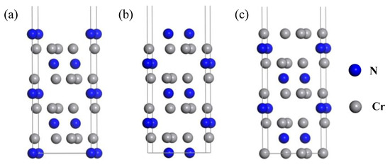 Consequently, we calculate the surface energies of 1N, 2N, and Cr terminations of Cr2N(0001), and 1N, 2N, and V terminations of V2N(0001), and the results are illustrated in Figure 2a,b, respectively. For 1N, 2N, and Cr terminations of Cr2N(0001), the values of are in the ranges of 1.25–1.92 J/m2, 0.90–2.24 J/m2, and 3.32–4.37 J/m2, respectively. For 1N, 2N, and V terminations of V2N(0001), the values of are in the ranges of 1.97–3.27 J/m2, 0.82–3.37 J/m2, and 3.13–5.13 J/m2, respectively. It can be concluded that 1N- and 2N-teminated Cr2N(0001) have lower surface energies, which indicates that they are more thermodynamically stable than the Cr-terminated slab. Similarly, the 1N and 2N-teminated V2N(0001) are demonstrated to be more thermodynamically stable than the V-terminated slab. However, for a comprehensive investigation, 1N, 2N, and Cr or V terminations are all considered in the following studies.