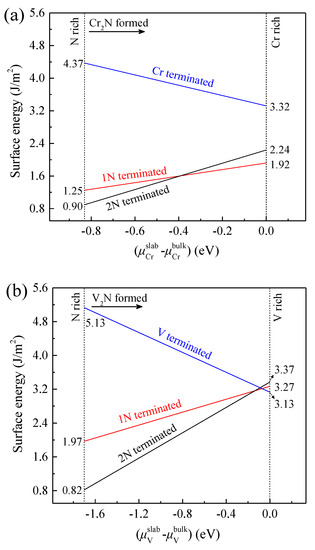 (a) Cr2N(0001) and (b) V2N(0001) surface energy as a function of chromium chemical potential ( − ) and vanadium chemical potential ( − ), respectively.