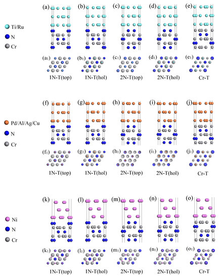 Interface models of M/Cr2N interfaces, including (a–e) M1(0001)/Cr2N(0001) (M1 = Ti and Ru), (f–j) M2(111)/Cr2N(0001) (M2 = Pd, Al, Ag, and Cu), and (k–o) Ni(111)/Cr2N(0001). The orientation relationships of the interface models are (0001)M1[20]M1//(0001)C2N[100]C2N, (111)M2[10]M2//(0001)C2N[100]C2N, and (111)Ni[2]Ni//(0001)C2N[100]C2N, respectively. There are five atom layers in the top views of (a1–e1), (f1–j1) and (k1–o1). The smallest spheres denote interfacial atoms of metal phases, from the second smallest to largest spheres are atoms from the first to fourth layers of Cr2N(0001). Five interface models for each M/Cr2N are considered: (a1,f1,k1) 1N-T top, (b1,g1,l1) 1N-T hollow, (c1,h1,m1) 2N-T top, (d1,i1,n1) 2N-T hollow, and (e1,j1,o1) Cr-T.