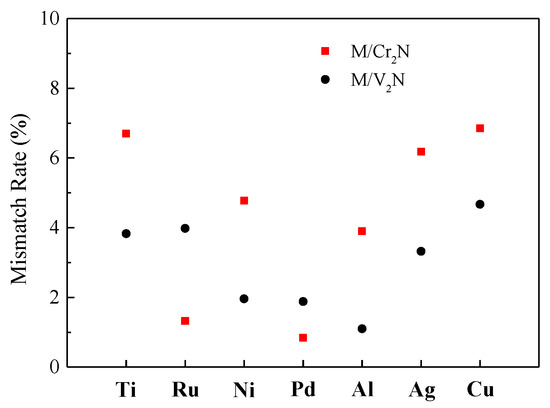 The M/Cr2N and M/V2N interface models were built in the same way because the lattice constants of Cr2N and V2N are approximate. Here, the softer M slabs are stretched to align with Cr2N and V2N slabs. Interfacial mismatch rates are calculated according to the change of lattice constant of the M slabs [26]. The calculated results of interfacial mismatch rates for the M/Cr2N and M/V2N interface models are illustrated in Figure 4, and they are unanimously less than 7%. Therefore, the interface models constructed in this work represent valid structures.