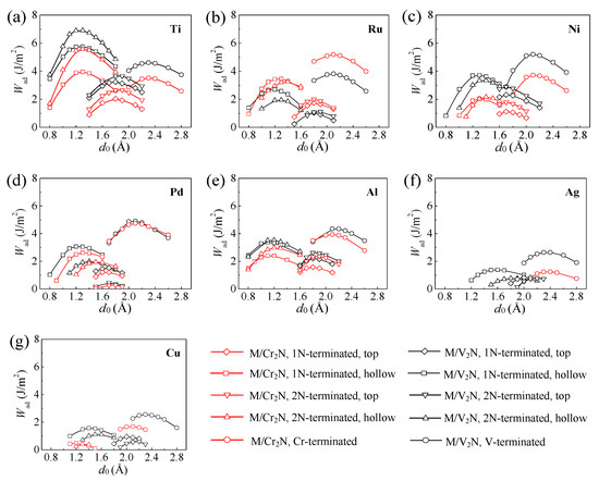 The values of Wad can be obtained by two different methods. The first method is the universal binding energy relation (UBER) method [22]. Figure 5 displays the values of Wad obtained by the UBER method versus the interfacial distance d0. The peak of the curve represents the optimal values of d0 and Wad. Therefore, we can have a preliminary evaluation on the optimal configuration among the M/Cr2N and M/V2N interface models for every metal considered. The results show that: (i) the Ti/Cr2N-2N(hol) interface model has the largest value of Wad among the Ti/Cr2N interface models; (ii) the /Cr2N-Cr ( = Ru, Ni, Pd, Al, Ag, and Cu) interface model has the largest value of Wad among the /Cr2N interface models. In addition, the M/V2N interface models have similar results to those of the M/Cr2N interface models for every metal considered. Accordingly, the optimal M/Cr2N and M/V2N interface models for every metal are determined, respectively. The second method adopts the optimal structures obtained from the UBER method, and relaxes the interface models fully. Three atomic layers at the top of the M slabs and four atomic layers at the bottom of the Cr2N(0001) and V2N(0001) slabs were fixed in their bulk positions. Then, the d0 and Wad values of the optimal M/Cr2N and M/V2N interface models for every metal after relaxation are obtained. Figure 6 displays both the values of Wad for the optimal interface models before and after relaxation. The values of Wad change a little during the relaxation processes, indicating that the interface models we constructed are stable. In addition, the value of Wad after relaxation for the optimal M/Cr2N interface model follows the order: Ru/Cr2N-Cr > Pd/Cr2N-Cr > Ti/Cr2N-2N(hol) > Ni/Cr2N-Cr > Al/Cr2N-Cr > Cu/Cr2N-Cr > Ag/Cr2N-Cr. Meanwhile, the value of Wad after relaxation for the optimal M/V2N interface model follows the order: Ti/V2N-2N(hol) > Ni/V2N-V > Pd/V2N-V > Al/V2N-V > Ru/V2N-V > Cu/V2N-V > Ag/V2N-V. The Ti/V2N-2N(hol), Ni/V2N-V, and Ru/Cr2N-Cr interface models exhibit the largest, second largest, and third largest value of Wad, 5.73, 5.30, and 5.05 J/m2, among all the optimal interface models considered, respectively.