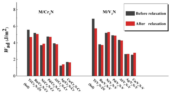 In addition, we performed test calculations for the verification on the reliability of the selected crystallographic interfaces in present work. We built other low-index crystallographic interface models as much as possible, and evaluated their interfacial bonding strengths by the values of Wad using UBER method. The calculation results are presented in the Supplementary Materials. It follows that other crystallographic interfaces have lower or negative values of Wad than the crystallographic interfaces we chose for this work. Therefore, we can confirm that the present crystallographic interfaces are preferred because of the enhanced interfacial bonding strength. This result makes sense for the coating applications motivating these composites. As we know, crystalline orientation is an important characteristic of coating growth. Interface orientation, which is constructed by crystalline orientation of each layer, have an important role in the interfacial mechanisms [15,26]. Therefore, the control of interface orientation may serve as a promising way to affect overall properties of the composites. For example, Wang et al. [26] theoretically demonstrated that the Ni(111)/CrN(111) interface orientation provides the greatest adhesion strength among the Ni/CrN interfaces, so the development of Ni(111)/CrN(111) interfaces is preferred in actual Ni/CrN coating applications. Toshihiko et al. [56] reported that the improvement of mechanical properties of Ti/TiN Multilayer coatings with increasing layer number could be explained by the evolution of preferred orientation from (111) to (100). With respect to the concerned M/Cr2N and M/V2N systems, the enhanced cohesion of their coating composites greatly associates with tailoring of special crystalline orientation of each component. Therefore, it can be inferred that the relations between deposition process and interface orientation are a great issue for the preparation of these coating composites.