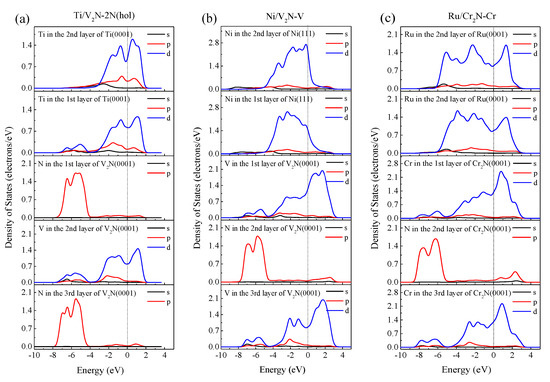 Figure 7a shows that the 3d orbital of the interfacial Ti atom interacts and hybridizes with the 2p orbital of the interfacial N atom at the energy of −5.0 and −6.5 eV in the Ti/V2N-2N(hol) interface model. Similarly, Figure 7b shows the Ni/V2N-V interface model exhibits the interaction and hybridization behaviors between interfacial Ni-3d and V-3d orbitals at the energy of −1.6, −2.3, and −3.3 eV, respectively. It can also be seen from Figure 7c that interfacial Ru-3d orbital interacts and hybridizes with the interfacial Cr-3d orbital for the Ru/Cr2N-Cr interface model at the energy of −1.2, −2.1, and −3.1 eV, respectively. These orbital hybridization behaviors imply the formation of covalent bonding between the atoms [38,57]. Therefore, the Ti/V2N-2N(hol), Ni/V2N-V, and Ru/Cr2N-Cr interface models all have interfacial covalent natures.