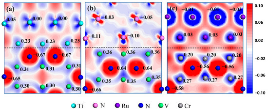 Charge density difference plots of (a) Ti(0001)/V2N(0001)-2N(hol), (b) Ni(111)/V2N(0001)-V, and (c) Ru(0001)/Cr2N(0001)-Cr interface models. Mulliken charge (unit: e) is labeled beside the atoms. The dashed lines represent the positions of the interfaces.