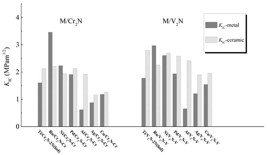 The values of KIC obtained for the optimal M/Cr2N and M/V2N interface models for every metal after relaxation are illustrated in Figure 9. Here, the values of KIC are given as a range, because they include two fracture toughness values indicative of fracture along the metal surface (KIC-metal) and along the ceramic surface (KIC-ceramic). The results show that: (i) both the Ru/Cr2N-Cr and Ru/V2N-V interface models have larger values of KIC-metal than the values of KIC-ceramic, which is determined by the considerably large value of E0001 obtained for Ru; (ii) the Ni/Cr2N-Cr interface model has a larger value of KIC-metal than the value of KIC-ceramic, which is because the value of E111 obtained for Ni is larger than the value of E0001 obtained for V2N; (iii) except Ru/Cr2N-Cr, Ni/Cr2N-Cr, and Ru/V2N-V, the other interface models have the larger value of KIC-ceramic than the value of KIC-metal. We rank the interfacial fracture toughness KIC of the interface models in term of the lower value between KIC-metal and KIC-ceramic. Accordingly, the KIC of M/Cr2N interface models follows the order: Ru/Cr2N-Cr > Ni/Cr2N-Cr > Pd/Cr2N-Cr > Ti/Cr2N-2N > Cu/Cr2N-Cr > Ag/Cr2N-Cr > Al/Cr2N-Cr. Similarly, the KIC of M/V2N interface models follows the order: Ni/V2N-V > Ru/V2N-V > Pd/V2N-V > Ti/V2N-2N > Cu/V2N-V > Ag/V2N-V > Al/V2N-V. In addition, the Ni/V2N-V, Ru/V2N-V, and Ru/Cr2N-Cr interface models exhibit the largest, second largest, and third largest value of KIC, 2.61, 2.26, and 2.21 MPam1/2, among all the interface models considered, respectively.
